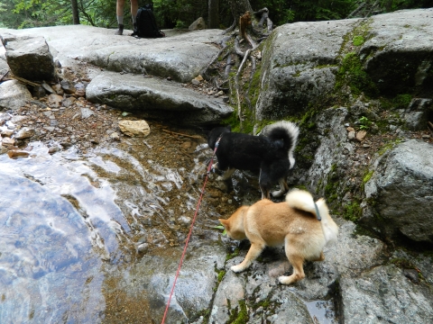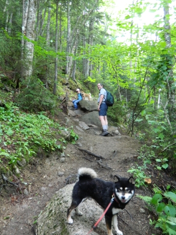On the way back down. The left photo is Norah (in pink) making her way down the west flank of Mt Lafayette (Zoe is barely visable a few feet in front of her), with Lonesome Lake visible on the other side of the notch. The right photo is Mark, Norah, James and Zoe in front of the AMC Green Leaf Hut (back below tree line).