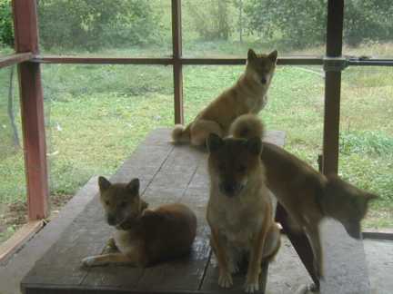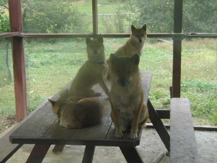 Here's the four shibas sitting on the picnic table on the back porch, waiting for us to let them in. Buttercup is in the back, Belle in the front, Moxie is napping, and Bota is jumping off.
