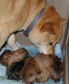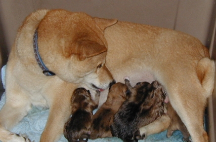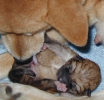 Buttercup licking her first puppy (Josh) dry, minutes after he was born.