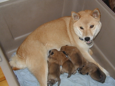 These pictures are of Buttercup and the puppies between the birth of the fifth and sixth puppies. (So all pups except Ainsley are present). The darker pups are the ones born most recently, while the lighter pups are older. If I had to guess, I would say the pups, from left to right, are Donna, Sam, Josh, Charlie, and CJ.