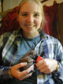 Left: Buttercup and the puppies. All the pups have gained weight and are doing very well. Doesn't Buttercup look happy! Right: My sister Laura and baby CJ (she's holding the bottle of red nail polish so we could ID the puppy in the photo). Laura is looking so happy because she knows that one of the pups will be hers. These pictures were taken on Sunday (pups were 3 days old).