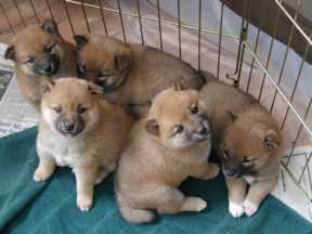 About 5 seconds after the last pictures were taken! Clip (left photo) has gotten up and is begging to be lifted out of the pen and the other pups (Del (front left), Nora (front right), Blitz (farthest left), Storm (back center), and Squall (farthest right)), shown in the right picture, are waking up.