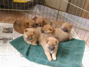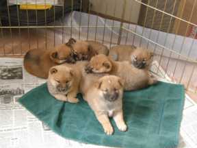 Taken Friday April 6th, here are all six puppies lying quietly and peacefully together. Clip (the little ham) is right in the center looking at the camera, Del is just behind Clip to the left and Nora is to the right, and in the back row from left to right are Blitz, Storm, and Squall.