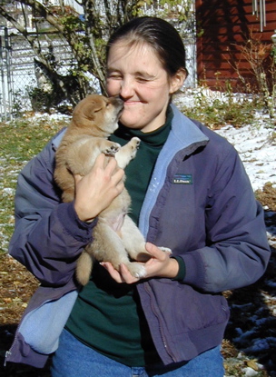 Left: Eli gives me a kiss. Right: Norah is very popular with puppies - that's Eli climbing her, Denali tugging on her slipper, and Kodi cheering.