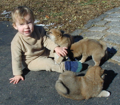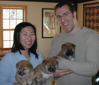 Max and Kathy, shiba parents-to-be, visiting from NYC. Left photo: Kathy with Kodiak and Max with Denali (photo from Kathy - thanks!). Right photo: the boys (from left to right), Eli, Denali and Kodi.