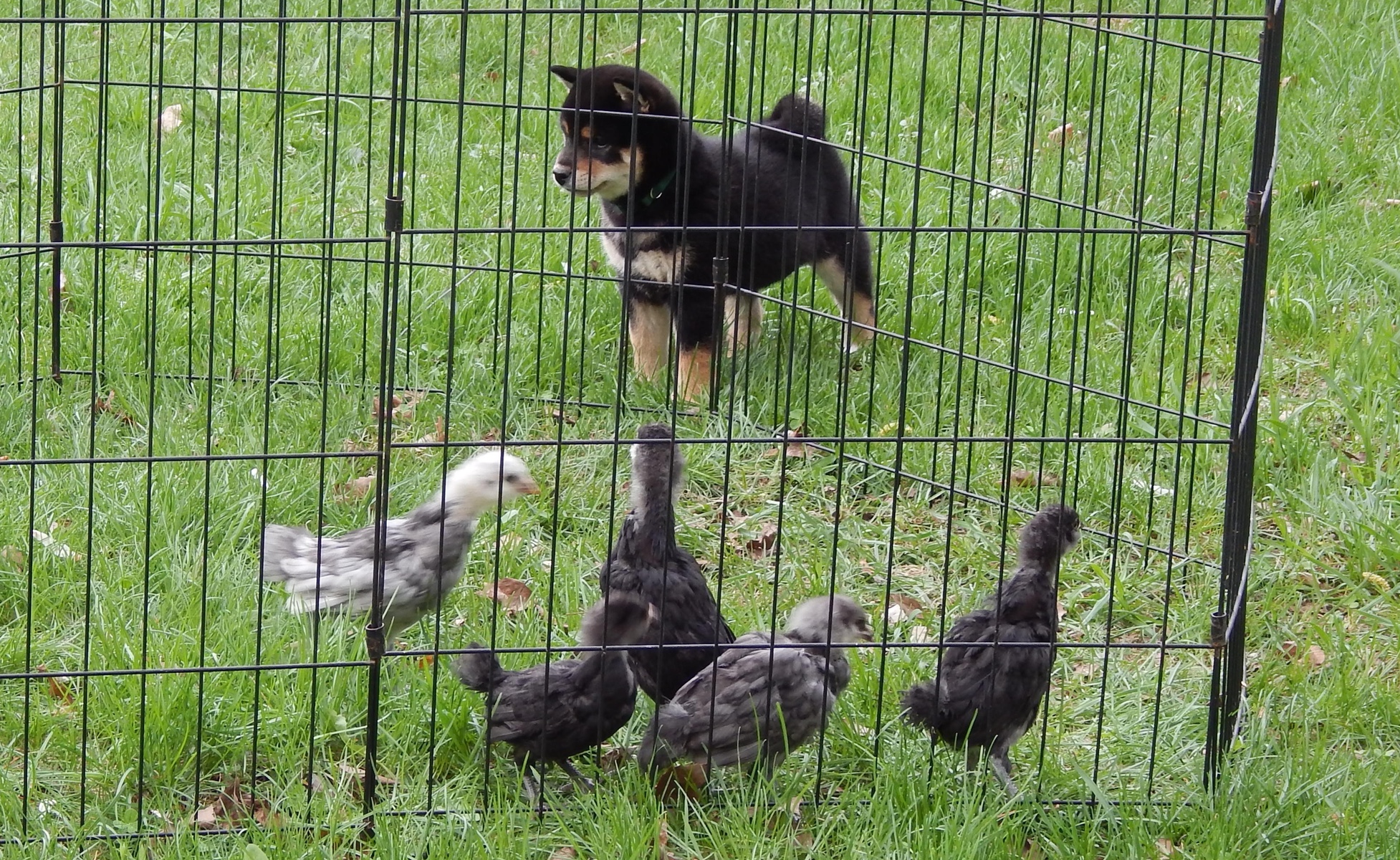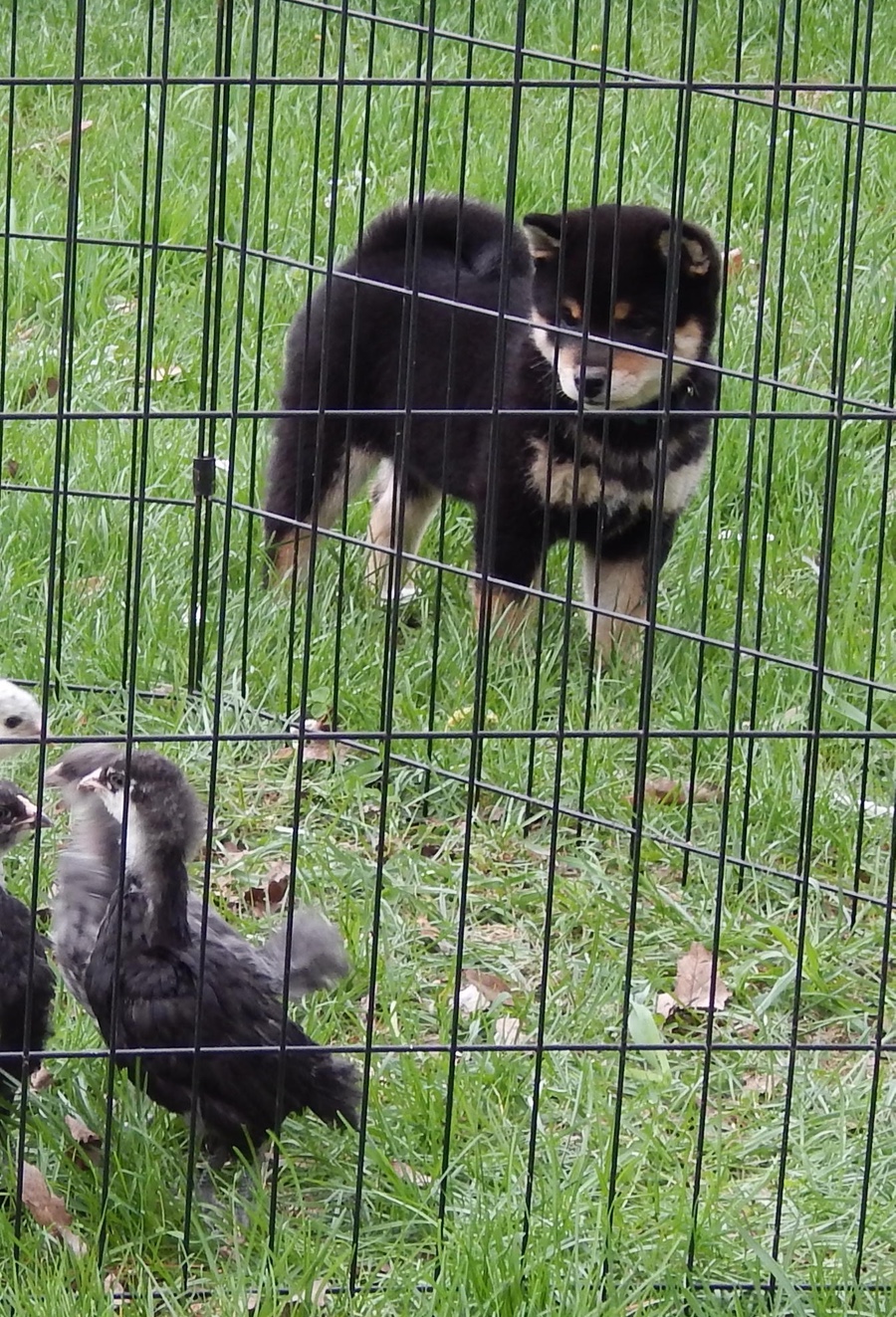 Athena and the chicks. For anyone uncomfortable with this video, please note that the chicks are not upset and are safely on the inside of the X-pen (if they had been upset or unsafe, I would have put an immediate stop to the game!) If you don't enjoy watching a baby puppy's natural prey drive awaken, I get that, but if that is the case, please be aware that the Shiba Inu (bred for centuries specifically to be a tough, bold, independent hunting dog) is probably not the right breed of dog for you! What I see in this video is 1) a very joyful puppy, and 2) a lot of potential for dog sports like Coursing, Barn Hunt, K9 Nose Work, Tracking, etc.